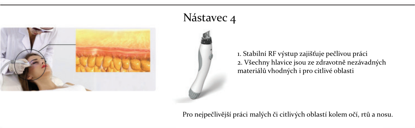 4 nástavce zajíšťují precizní ošetření, ať už se jedná o velké, malé či citlivé části těla a obličeje. Každý nástavec obsahuje všech 5 technologií: