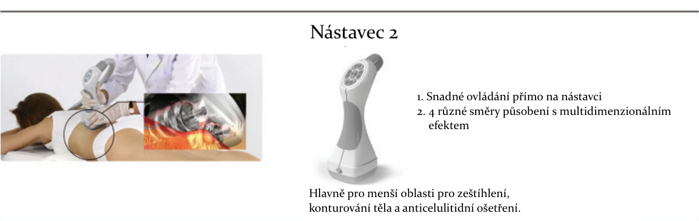 Kombinace mechanického, tepelného a radiofrekvenčního působení na pleť přináší zaručené výsledky v podobě úbytku celulity, zpevnění těla, zpevnění pokožky, liftingu obličeje, vypnutí pleti, zlepšení textury pleti, redukce vrásek a to vše neinvazivní a šetrnou metodou.